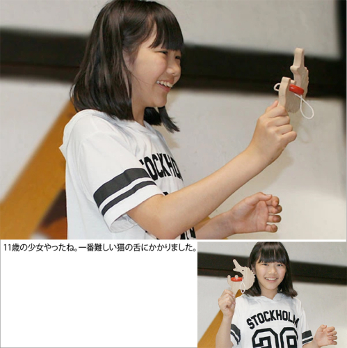 こちらのケン玉は、舌が猫になっている男性を形どったユニークな形をしているのが特徴です。赤い木のリングを大きな長い鼻に掛けるのは割と簡単ですが、猫舌・下顎にリングを掛けるのは至難の業です。それぞれの場所に点数をつけて競争するのも楽しいですね。