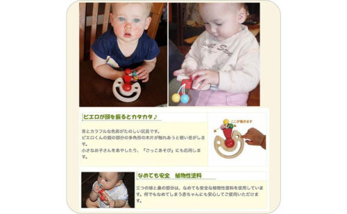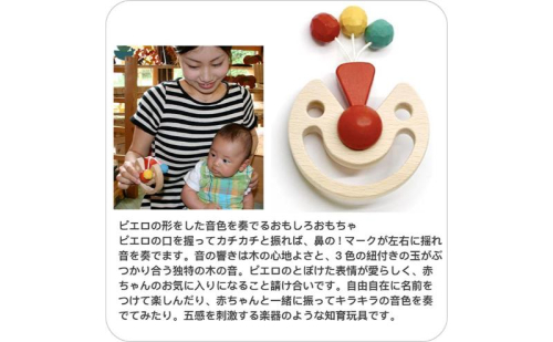 - ぐずっちゃう赤ちゃんもニッコリの楽しいピエロのおもちゃが入っています。おもちゃの材質はブナ材 日本製 psc