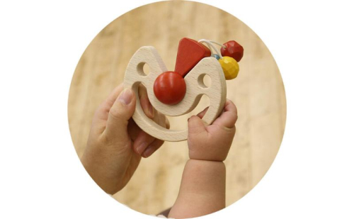 ★日本グッド・トイ受賞おもちゃ ピエロの口を握ってカチカチと振れば、鼻の!マークが左右に揺れ音を奏でます。音の響きは木の心地よさと、3色の紐付きの玉がぶつかり合う独特の木の音。ピエロのとぼけた表情が愛らしく、赤ちゃんのお気に入りになること請け合いです。自由自在に名前をつけて楽しんだり、赤ちゃんと一緒に振ってキラキラの音色を奏でてみたり。五感を刺激する楽器のような知育玩具です。