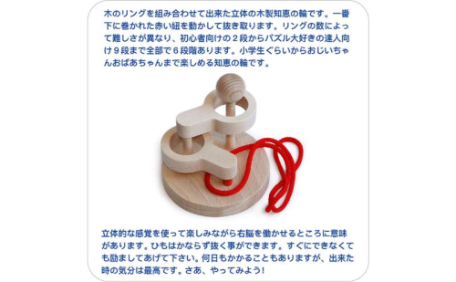 ★日本グッド・トイ受賞おもちゃ 木のリングを組み合わせて作られた立体型の「知恵の輪」です。一番下の段に巻かれた赤い紐を抜き取って遊びます。こちらの2段型の知恵の輪は、4~5才から挑める難易度となっております。空間認識力、論理的思考、推理力…。お子様の成長に欠かせない様々な能力を養うことができます。プレゼントとしても最適で、お孫様やお子様への贈り物として、また大人のリフレッシュ遊びや高齢者の認知症予防にも、幅広くご利用いただけます。木のぬくもりが感じられる、心豊かな時間をお届けします。