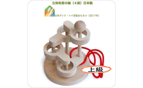 ★日本グッド・トイ受賞おもちゃ 木のリングを組み合わせて作られた立体型の「知恵の輪」です。一番下の段に巻かれた赤い紐を抜き取って遊びます。こちらの4段型の知恵の輪は、大人も挑める難易度となっております。空間認識力、論理的思考、推理力…。皆様の成長に欠かせない様々な能力を養うことができます。プレゼントとしても最適で、お孫様やお子様への贈り物として、また大人のリフレッシュ遊びや高齢者の認知症予防にも、幅広くご利用いただけます。木のぬくもりが感じられる、心豊かな時間をお届けします。 問題 赤い紐を抜き取って下さい。抜き取れたらまた元の位置に戻します 心構え1   水の流れるごとく素直に考えるべし 心構え2   腕力、刃物を使わず、知恵を使うべし 心構え3   決してあきらめるべからず 心構え4   抜き取ったひもはスタートの位置に戻すべし