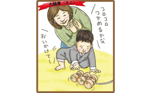 ロープを引いてごろごろ転がしたりたり、障害物を乗り越えたり、たくさんのの遊びができるおもちゃです。 ロープを引くと、カラカラと軽快な音が響き渡り、6つの車輪がそれぞれにユーモラスに回転します。進行方向に転がる車輪と逆に転がる車輪の動きは、見る者を魅了し、思わず手を伸ばしたくなるような楽しい仕掛けです。 赤ちゃんが手に入れようと必死になる様子は、まるで愛らしい動物たちが遊ぶような、自然なかわいらしさを感じます。