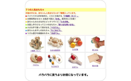▼桐の木箱の中には、銀河工房の人気赤ちゃんおもちゃが7種類入っています。