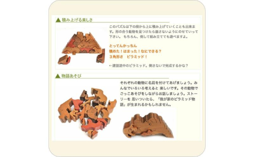 小さな子供さんが遊ぶ際には、始めは動物のピース1つ2つで「ごっこ」遊びをするのが良いかも知れません。2個だけ3個だけの簡単なパズルから始めて、慣れてきたら全てのピースでピラミッドパズルに挑戦してみましょう。 五感と共に造形感覚・創造性を大きく養える、まるで美術品のような素敵なパズルです。