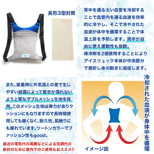 保冷剤を2個使用することによりアイスリュック本体が中央部分で屈折し体の動きに追従します。また、装着時に外気温との差で生じやすい結露によって着衣が濡れないよう上質なダブルメッシュ生地を採用。