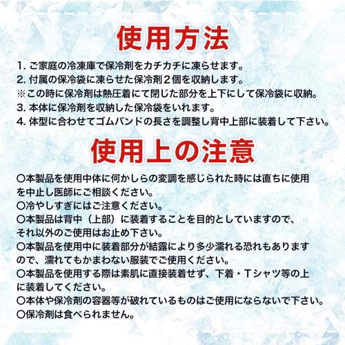 凍らせた保冷剤を本体内部に収納し背中に背負うよう装着します。