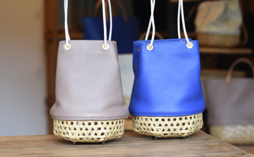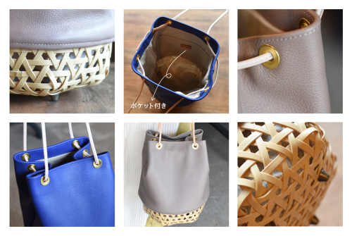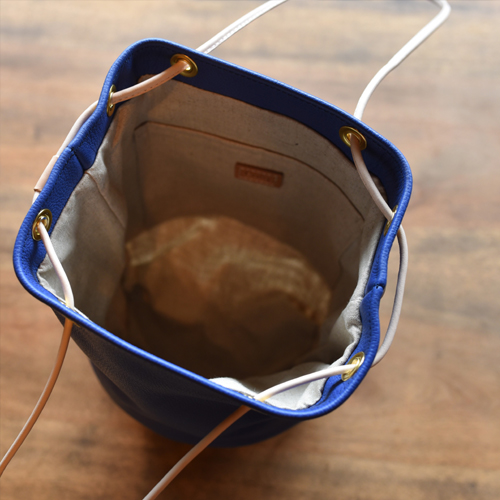 ふっくら柔らかいタイプの牛革を使った巾着カゴバッグです。 シュリンク加工の革なのでギュッとしぼった時にナチュラルなドレープが生まれ美しいシボとツヤがでます。伸縮性に優れているので、ヒモを引くだけで口元がふさがります。サイズは小ぶりでコロンっとしておりますが、長財布は縦向きに収納で口元も閉じます。化粧ポーチや小さなペットボトルも問題なく収納でき普段のお出掛けにちょうど良いサイズになっております。 ブルーは発色が良く爽やかな印象でナチュラルな竹と相性が良いので様々なスタイルで合わせて頂けます。