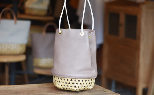 • BB003-2-1 竹と牛革の巾着カゴバッグ ピンクベージュ