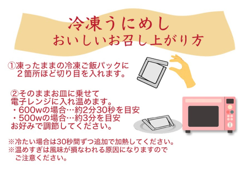 冷凍状態の本品を電子レンジで温めるだけで美味しい「うにめし」が楽しめます。