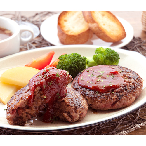 ハンバーグ:牛肉(国産)、植物油(国内製造)、水飴、炒め玉ねぎ、玉ねぎ、砂糖、醤油、食塩、トマトペースト、パン粉、動物油脂、コショウ未、玉ねぎエキス、ナツメグパウダー、白キクラゲ抽出物、酵母エキス/pH調整剤、酸化防止剤(V.C)、増粘多糖類、調味料(アミノ酸等)、(一部に小麦・乳成分・大豆を含む)