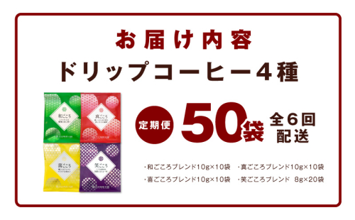 - 厳選ドリップコーヒー4種50袋 定期便 全6回【毎月配送コース 珈琲 こーひー コーヒー 自家焙煎 オリジナル ギフト キャンプ アウトドア 家計応援】 099Z141
