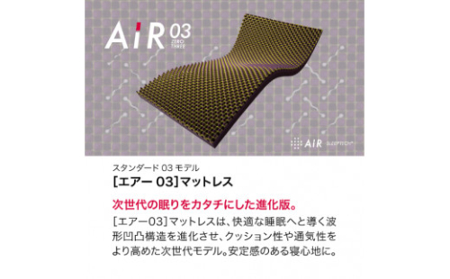 [エアー03]マットレスは、快適な睡眠へと導く波形プロファイル構造を進化させ、クッション性や通気性をより高めた次世代モデル。体圧分散性と安定感に優れ、スリーピング・パフォーマンスの向上を実感できるサポート・ギアです。