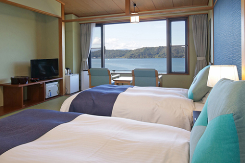 客室からは琵琶湖をはじめ、沖島や対岸の高島まで見渡せ、温泉「宮ヶ浜の湯」でおくつろぎいただけます。