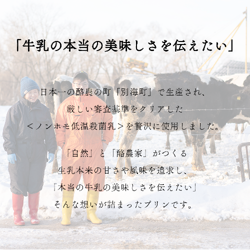 プライドと情熱を持った酪農家の作る質の高い別海町産の生乳と栗山町の卵を贅沢に使ったプリンです。