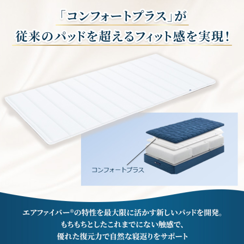さらに、エアファイバー(登録商標)の特性を最大限に活かす新しいパッド「コンフォートプラス」は、独自のポリエステル綿「X-Fiber」を採用し、もちもちとしたこれまでにない触感で、従来の綿パッドよりも優れたフィット感と耐久性を実現しました。