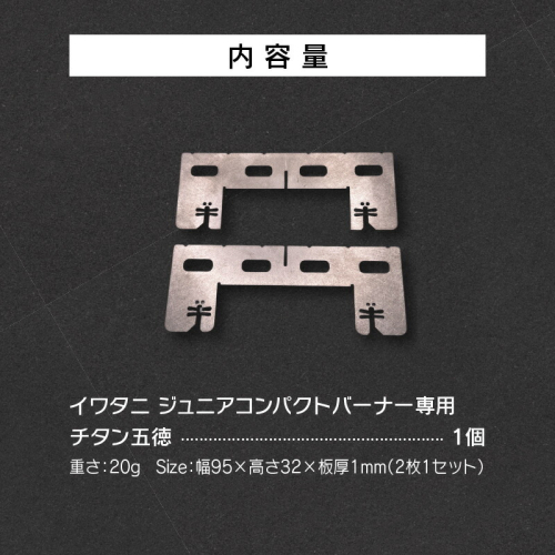 [使いづらいジュニアコンパクトバーナーの五徳を使いやすく] 本製品を使用することでシェラカップやメスティンなどのクッカーを安定して使用することができます。 [軽量で耐熱性に優れ強度のあるチタン製] 軽くて堅牢なチタン製の五徳です。ご使用いただくにつれ熱による色の変色もお楽しみいただけます。 使用後はバーナー本体と一緒に本体付属のケースに収納できます。 [商品仕様] 寸法: 95x32mm 厚さ: 1mm 重さ: 20g Made in Japan *バーナー本体は付属しません。 ■地場産品基準 レーザー切断、バリ取り、研磨、仕上げまでの全工程を区域内で行うことにより付加価値が生じているもの。