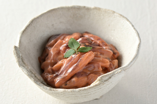 小野万の伝統の技で、じっくり仕込んだ、まろやかでコクのある味の塩辛です。柔らかいいかを使用しており、口の中でとろけるような食感をお楽しみいただけます。