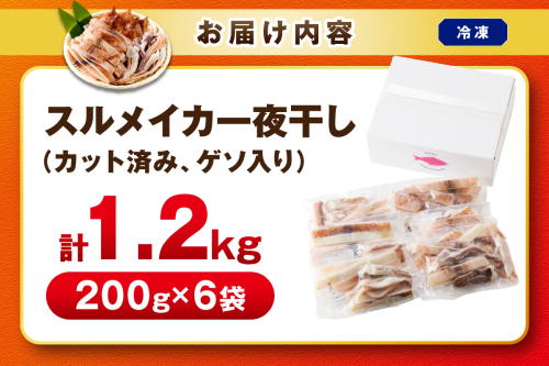 島根県産スルメイカ一夜干しカット済 計1.2kg(小分け200gx6袋) いか スルメ 一夜干し 1.2キロ カット済 おつまみ 小分け 個別包装 少量 贈答 ギフト 贈り物 【005_0118】