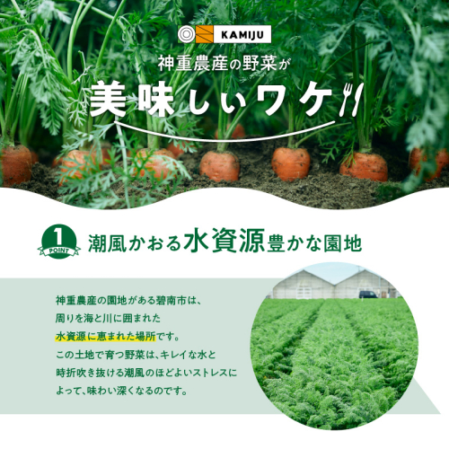 ミネラルたっぷり与えて育てた、人参臭さの少ない甘み豊かな神重農産が育てた人参です。