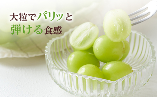 美しい外観と、大粒。高糖度をほこるシャインマスカット。種がなく皮ごと食べられます。噛んだ瞬間パリッと音をたててはじけ、弾力のある食感を楽しむことができます。