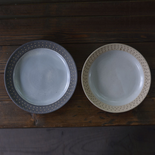 土の素地を感じる焼き締めに丹念にドット柄をあしらい、ぽってりとした質感の釉薬を施した、手作りならではの柔らかな印象のうつわです。
