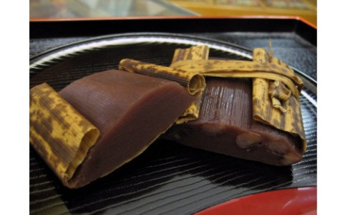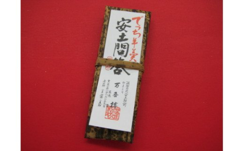 安土名物『まけずの鍔』は、桶狭間の合戦以降、連戦連勝した織田信長公愛刀の鍔をそのまま型どった、2色餡入りの縁起のいい“もなか”です。勝利を呼び込んだ信長公の鍔にあやかり、勝負事の必勝祈願や受験生の合格祈願用としても愛されている逸品です。皮は、近江特産の滋賀羽二重餅を使用。1枚1枚丹念により香ばしく焼き上げています。あんこは、厳選した北海道産の大納言小豆と大手亡(インゲン豆)を安土の伏流水を使って、ふっくら、しっとりと炊き上げました。 でっち羊羹「安土問答」は自家製小豆こし餡と粒餡を竹の皮で包み、じっくりと蒸し上げた逸品で、竹の皮の芳香な香りと、もちもちした食感が人気です。