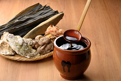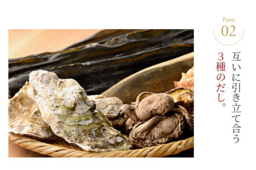 和食文化の要・醤油と旨み文化を伝えるために「牡蠣醤油」を開発。美味しさの秘訣は醤油と牡蠣とのマッチング。当店の特殊製法による牡蠣のエキスに合わせた、まろやかな醤油を地元醤油屋さんが叶えてくれました。さらにカツオだし、昆布だし、シイタケエキスを合わせ、バランスの良い旨みだし入り牡蠣醤油になりました。