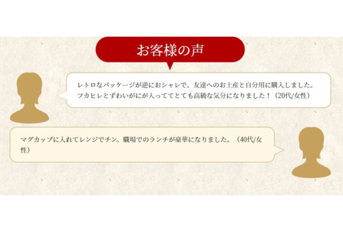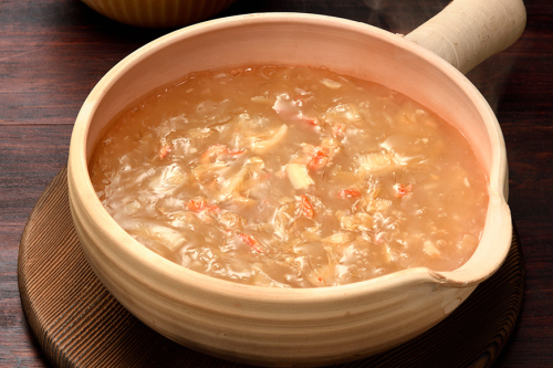 ガラスープ(豚ガラスープ、鶏ガラスープ、ビーフエキス、その他)、ふかひれ、ずわい蟹、食塩、卵白、醤油、醗酵調味液、中華調味料、オイスターソース、ポークエキス、砂糖、貝エキス、全粉乳、/増粘剤(加工デンプン、キサンタンガム)、調味料(アミノ酸等)、カラメル色素、酸味料、(一部に豚肉・鶏肉・牛肉・大豆・小麦・乳成分・ゼラチン・ごま・アワビを含む)