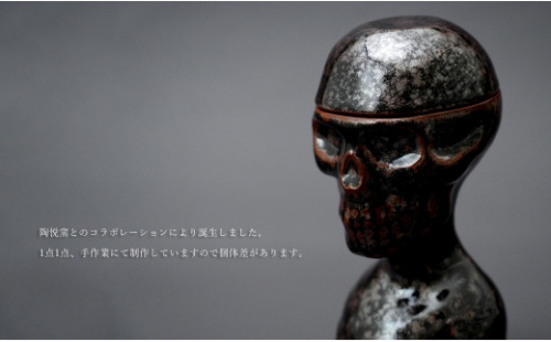 インパクトのあるガイコツ型グラスです。 侍の生き様の特徴を表現しています。 蓋になっている頭部は、裏返してテーブルに置いても安定するのでおつまみやスパイス入れとしてお使いいただけます。 陶悦窯とのコラボレーションにより誕生しました。 1点1点、手作業にて制作していますので個体差があります。                                           窯元:SHIN KOYAMA×陶悦窯 提供:ギャラリーシン 小山 真