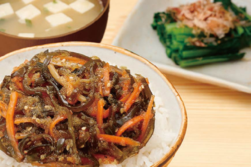 昆布(国産)、数の子、人参、本みりん、砂糖混合異性化液糖、しょう油、干しいか、醸造酢、ごま、食塩、唐辛子/ソルビット、調味料(アミノ酸等)、酸味料、メタリン酸ナトリウム、着色料(カラメル色素)、保存料(ソルビン酸K)、増粘剤(キサンタン)、甘味料(甘草)、くん液、(一部に小麦・いか・大豆・ごまを含む)