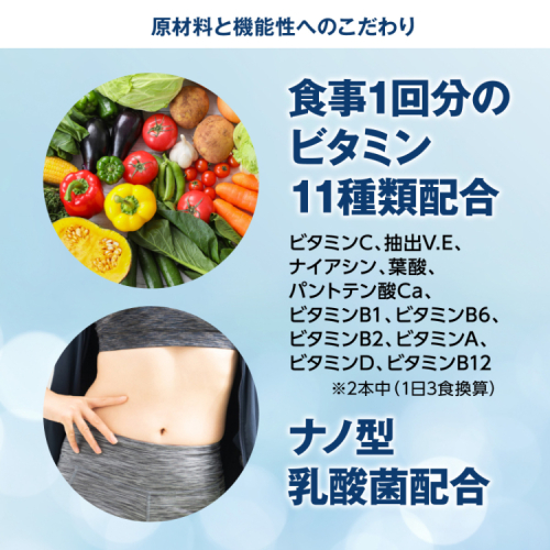 栄養吸収の効率性を最大限生かすため「ホエイ+カゼイン+大豆」の3つのたんぱく質を2本で10.4gとたっぷり使用するほか、11種類のビタミンと、74種類の天然ミネラルを含む化石サンゴカルシウム、100億個の乳酸菌を配合しました。