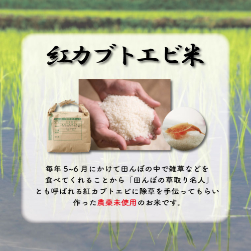 毎年5~6月にかけて田んぼの中で雑草などを食べてくれることから「田んぼの草取り名人」とも呼ばれる紅カブトエビに除草を手伝ってもらい作った農薬未使用のお米です。