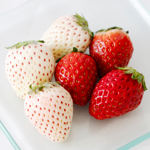 赤いちごと白いちごを半分づつお詰めして、見た目も味もうまかっぺ。甘くて美味しいイチゴをぜひ!