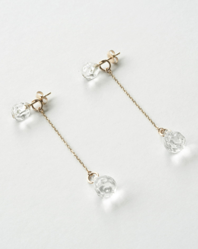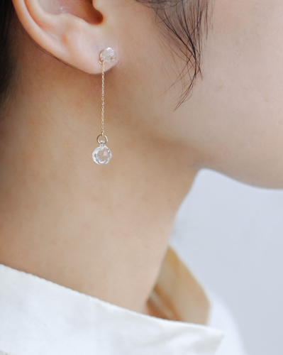 小粒ながら光を集めてきらきらと、華やかな存在感を放つデザインです。 2wayで印象を変えてお楽しみいただけます。 金具はK10(10金)を使用しています。 【素材】 耐熱ガラス、K10 【サイズ】 ガラス大きさ/上φ5mm/下φ6×9mm チェーンの長さ/25mm