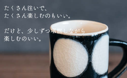 ■暮らしに、手しごと感じる器を。 忙しない現代社会だからこそ、過ごしたい丁寧な日々。 家族と一緒に友人と一緒に、大事な人と一緒に囲む食卓だから、 手しごと感じる器を並べて、何気ない時間を大切に過ごしませんか。 ■ちょうどいい。だから使いやすい。 筒型マグカップは、たくさんの量は入りません。 だから、ちょうどいいんです。 たくさん注いで、たくさん楽しむのもいい。 少しずつ堪能しながら楽しむのもいい。 朝の時間やおやつの時間を、ゆっくりと少しずつ、 緑茶やコーヒーを楽しむのはいかがでしょうか。 来客の際にお出しするのにもおすすめです◎ ■和モダンの雰囲気がかわいい丸紋模様 手描きで描く丸紋模様が和モダンな雰囲気でかわいい。 呉須が渋みのある絵の具になっているので、かわいい絵柄だけど、 渋さが加わり、和の雰囲気を感じる器です。 食器 カップ 贈答 窯元:喜鶴製陶 喜右エ門 提供:合同会社 喜鶴製陶