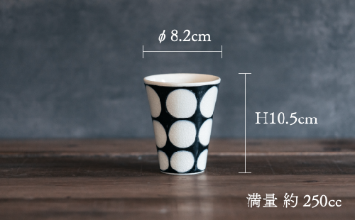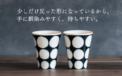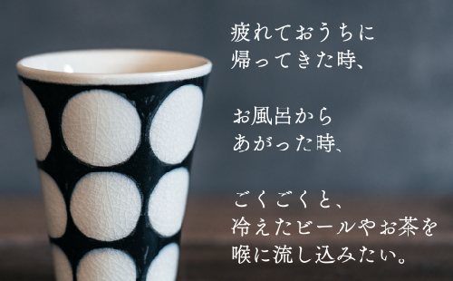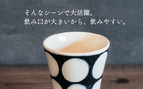 ■ごくごく飲みたい!そんなあなたに。 お仕事でくたくたに疲れて帰ってきた後やお風呂でさっぱりした後、 キンキンに冷えたビールやお茶をごくごくと喉に流し込みたいですよね。 そんな飲みっぷりの良さを叶えるのがフリーカップです。 飲み口が大きいので、とっても飲みやすい! また少し反った形になっているので、手に自然とフィットして持ちやすい形になっています。 ごくっごくっ♪と、このフリーカップで飲みっぷりよく飲んでいるのが想像できてきませんか? 普段使いはもちろん、ギフトとしてもおすすめですよ◎ ■和モダンの雰囲気がかわいい丸紋模様 手描きで描く大胆なデザインの丸紋模様が和モダンな雰囲気でかわいい。 呉須が渋みのある絵の具になっているので、かわいい絵柄だけど、 渋さが加わり、和の雰囲気を感じる器です。 ■暮らしに、手しごと感じる器を。 忙しない現代社会だからこそ、過ごしたい丁寧な日々。 家族と一緒に、友人と一緒に、大事な人と一緒に囲む食卓だから、 手しごと感じる器を並べて、何気ない時間を大切に過ごしませんか。 食器 カップ 贈答 窯元:喜鶴製陶 喜右エ門 提供:合同会社 喜鶴製陶