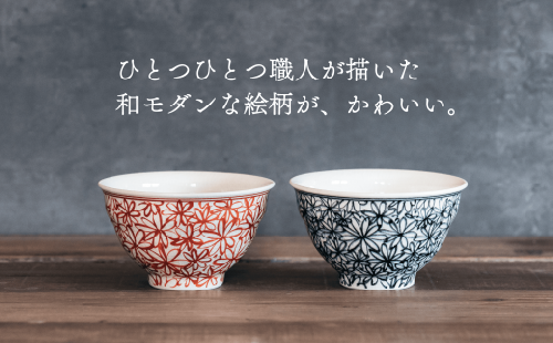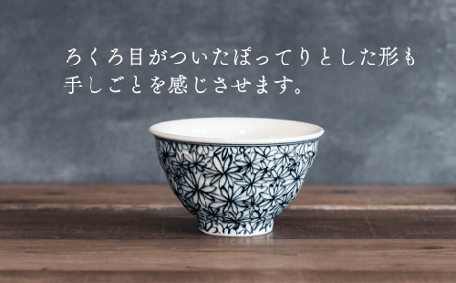 喜鶴製陶のお茶碗は、独自にブレンドした陶土と和の雰囲気を感じさせる手描きの絵柄に、ろくろ目のある器の形、それぞれが手しごとを感じさせます。