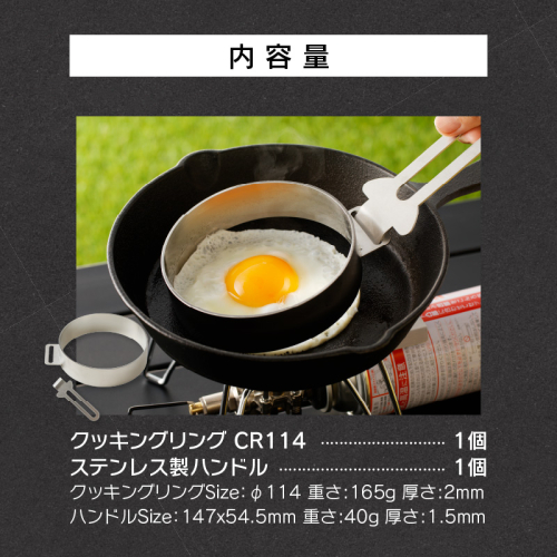 きれいに丸のホットケーキが作れるクッキングリング。 ステンレス製なので洗って繰り返しお使いいただけます。 ホットケーキはもちろん、目玉焼きやキッシュなど形をきれいに作りたい調理の際に便利です。 30mmの高さがあるので十分に分厚く調理できます。 持ち上げるハンドルは分離にしたのでキャンプなどで持ち運ぶ際、コンパクトに収納できます。 ハンドルが付属 ステンレス製の持ち上げるハンドルが付属。 使わない時は長穴部をフックなどに引っ掛けられます。 鍛冶屋の頓珍漢の製品は愛知県小牧市の自社場にて品品職が丹精を込めて製作し、お客様にお届けしています。 ■地場産品基準 材料切断、バリ取り、曲げ加工、溶接、研磨、仕上げまでの全工程を区域内で行うことにより付加価値が生じているもの。