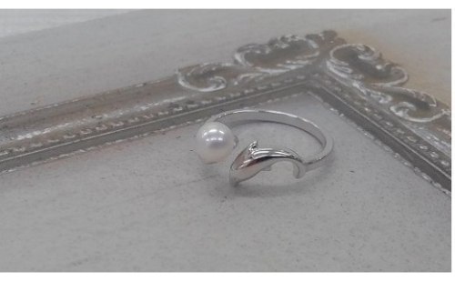 あこや本真珠のついたシルバー製のリングです。イルカがとってもチャーミングです。フリーサイズです。5m/mのベビーパールです。