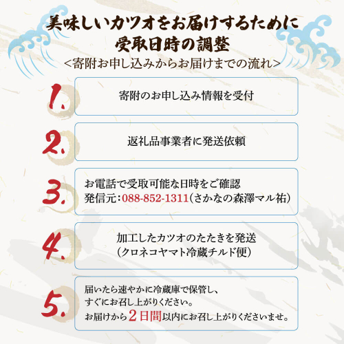 ・冷蔵便の商品ですので良質なカツオが入った時点で出荷します。そのため、台風時や年末年始は仕入れができないためご希望に添えないことがございます。ご了承ください。