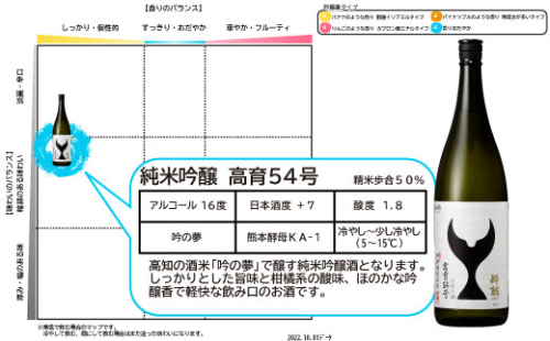 酔鯨 純米吟醸 高育54号はしっかりとした旨みを感じさせ、爽やかな柑橘系の酸味とほのかな吟醸香は軽快な飲み口を演出します。淡麗辛口の軽やかな旨みは合わせるお料理の美味しさを引き出し飲み飽きしないお酒です。