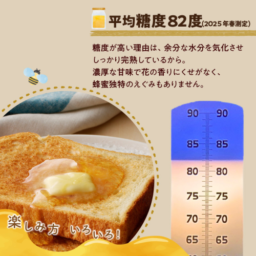 糖度は平均82度と非常に高い完熟蜂蜜になっており、濃厚な甘味で花の香りにくせがなく、蜂蜜独特のえぐみもありません。