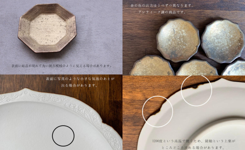 マット感のある質感の桔梗渕皿や、豆皿、金塗りの八角豆皿、桔梗渕型の箸置きをセットにしました。