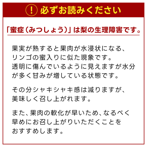「蜜症」は梨の生理障害です。果実が熟すると果肉が水浸状になる、リンゴの蜜入りに似た現象です。透明に傷んでいるように見えますが水分が多く甘みが増している状態です。その分シャキシャキ感は減りますが美味しく召し上がれます。