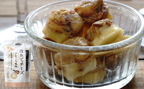 プロセスチーズ(国内製造)、ボイルほたて貝(ほたて貝(北海道産))、オリーブオイル、砂糖、和風だし、食塩、ローストガーリック、しょうゆ、ブラックペッパー、唐辛子、粉末醤油/乳化剤、酸味料、酒精、メタリン酸Na、(一部に小麦・乳成分・さば・大豆を含む)