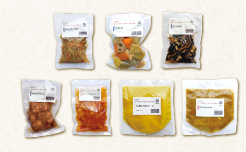 ハンバーグトマトソース(1枚×1パック)・ひじき味付(90g×1パック)・筑前煮(100g×1パック)・和風肉だんご(115g×1パック)・きんぴらごぼう(100g×1パック)・ポークカレー(220g×1パック)・かぼちゃのスープ(200g×1パック)
