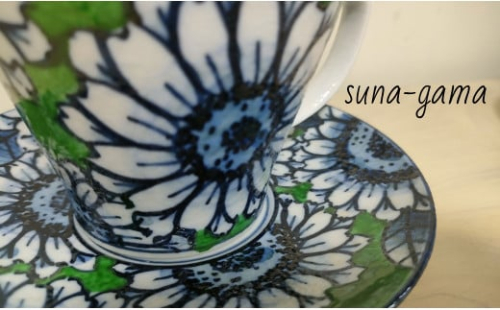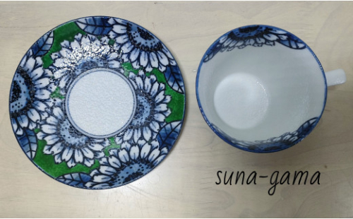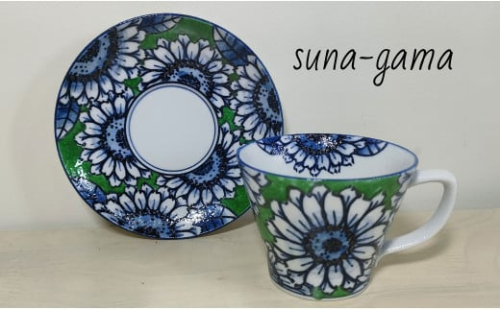 一つ一つ手描きのため、柄の位置や色の濃淡が多少異なります。 大きな向日葵を描き、その上から釉薬を吹き付ける事(志野と言われる昔からの有田焼の技法)で絵柄に深みが出ます。 さらに緑の上絵付け、伝統的な有田焼の技法で作成し砂窯独特のコーヒー碗ができました。 同じシリーズの赤色や金色のコーヒー碗がありますので、揃えてみてはいかがでしょうか。 窯元:砂窯(すながま) 梶原眞砂子 提供:(株)親和貞陸