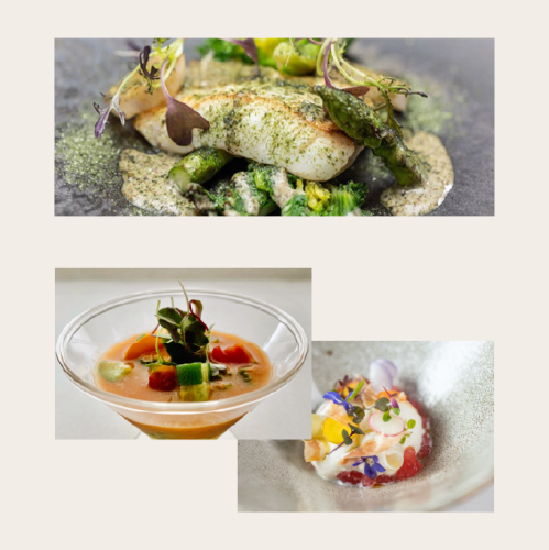 例:アミューズ、前菜、お魚料理、お肉料理、デセール、食後のコーヒー、小菓子