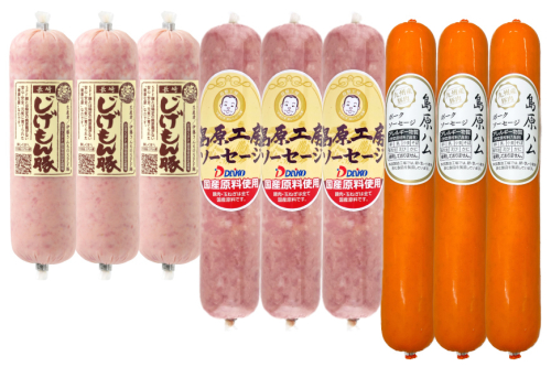 【島原工房ソーセージ】 豚肉(国産)、たまねぎ(国産)、豚脂肪、結着材料(でん粉、小麦粉)、砂糖、食塩、香辛料/調味料(アミノ酸)、リン酸塩(Na)、酸化防止剤(ビタミンC)、発色剤(硝酸K、亜硝酸Na)、(一部に小麦・豚肉を含む)