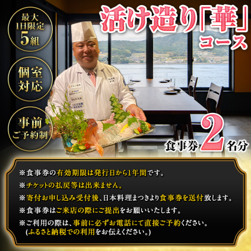 活け造り「華」コース食事券(2名分) 食事券 活け造り 個室 天然魚 料理 日本料理 漁師の店 コース料理 魚介類 チケット 海鮮 海の幸 ディナー ランチ お食事券 予約制 【日本料理まつき】akn022-03
